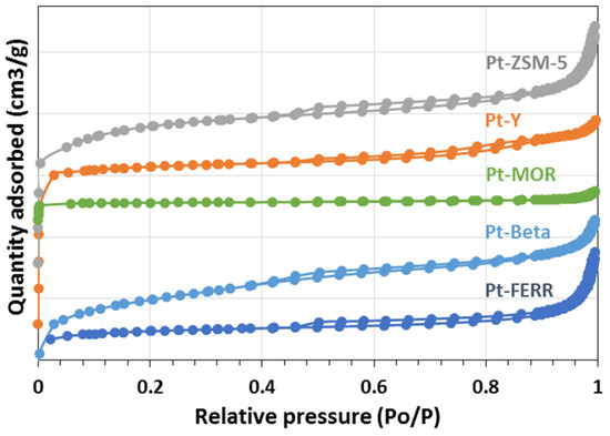 The nitrogen isotherms of the prepared Pt-incorporated zeolite materials (Y, Beta, MOR, FERR, and ZSM-5).