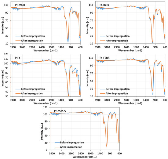 The FTIR spectra of the prepared Pt-incorporated zeolite materials (Y, Beta, MOR, FERR, and ZSM-5) before and after Pt incorporation.
