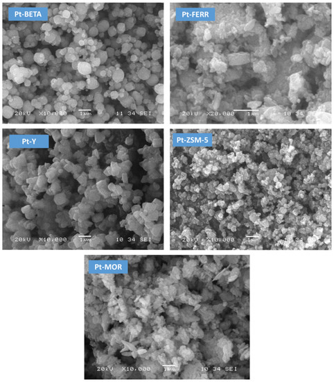 The morphological structure of the prepared samples was investigated by SEM analysis. Figure 4 presents the SEM micrographs of the fabricated samples. Pt-Y exhibited a highly crystalline phase with partially replicated octahedral crystals (average size between 1 and 1.5 μm) with a few aggregates [30]. Pt-Beta showed a sphere-like morphology with a broad average size of 0.2–1 μm. Pt-MOR exhibited fused and aggregated prism-like crystals with an average crystal size of 1–1.5 μm [31]. Finally, Pt-ZSM-5 exhibited the aggregates’ hexagonal crystal structure [32]. The average crystal size was hard to detect due to the high aggregation. More importantly, no Pt-separated phase could be detected in any micrograph, as an indication for the total incorporation of the Pt metal into the zeolite matrix. Moreover, because water and Pt source were used only in the sample preparation, no carbon or carbonized species could be detected in the micrographs, which is an indication for the purity of the prepared samples.