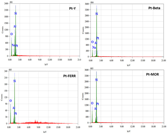 EDX analysis coupled with SEM analysis was carried out to reveal the chemical composition of the prepared catalytic samples. Figure 5 shows the obtained results of the EDX analysis for the Pt-incorporated zeolite materials.