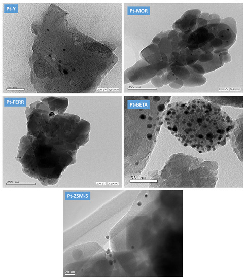 The micrographs of the entire samples show the Pt nanoparticles with an average size of 5–10 nm incorporated into the different supports with high distribution. Moreover, no bulky Pt particles could be observed, nor other bulky crystals, indicating the high efficiency of the synthesis method to incorporate Pt nanoparticles into the different zeolite samples.