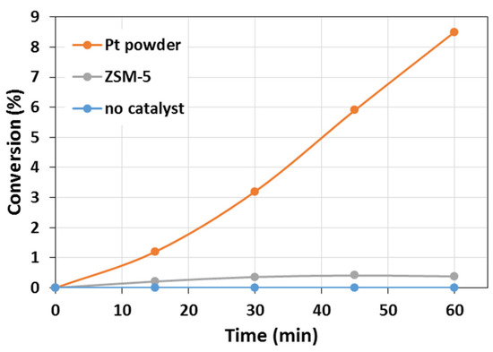 First, 1 wt% of Pt was incorporated into five zeolite samples using an impregnation technique. In the real experiment, 1 g of the applied zeolite sample was suspended in 50 mL of distilled water. Then, a stoichiometric amount of PtCl2 was dissolved in the above-mentioned suspension and the overall mixture was vigorously stirred for 48 h. After stirring, the mixture was dried at 100 °C for 24 h to remove the water and the solid powder was collected and finally calcined for 4 h at 450 °C. The obtained solid powder was carefully grinded and sieved through a 65-micron particle sieve.