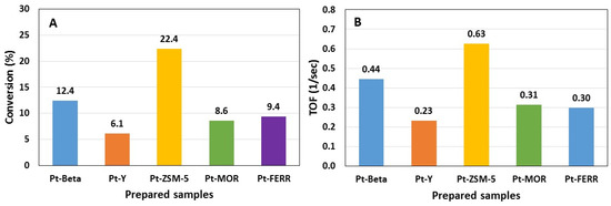 The catalytic performance of the Pt-incorporated zeolite samples is presented in Figure 8. Pt ZSM-5 exhibited the best catalytic performance, in which 22.4% conversion of cyclohexene was obtained with a total TOF of 0.63 s−1. The Pt-Beta sample was able to convert 12.4% of cyclohexene with a total TOF of 0.44 s−1. Similar catalytic behavior was observed with Pt-MOR and Pt-FERR samples, and almost the same TOF, 0.3 s−1, was obtained. Finally, Pt-Y exhibited the lowest activity: only 6% of cyclohexene was converted with a total TOF of 0.23 s−1.