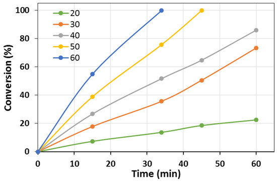 The hydrogenation reaction over Pt-ZSM-5 was successfully performed under room temperature and, therefore, the study was extended to run the reaction under elevated temperatures up to 60 °C. The aim of this study was to calculate the kinetics of the hydrogenation reaction in addition to the activation energy calculation. The conversion % of cyclohexene over Pt-ZSM-5 at different reaction temperatures is plotted in Figure 9. The obtained results showed a typical improvement in the catalytic performance when the reaction temperature was increased. The conversion of cyclohexene reached 100% over Pt-ZSM-5 at 50 °C after 45 min, and at 60 °C after 35 min. Moreover, Pt-ZSM-5 did not suffer from thermal deterioration, and the structure of ZSM-5 was maintained and did not collapse as a result of applying 5 atm pressure and 60 °C temperature.