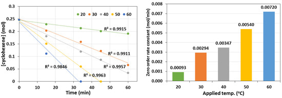 The zero-order kinetic model of cyclohexene conversion over Pt-ZSM-5 at different reaction temperatures is plotted in Figure 10. The figure shows that all obtained conversion data are perfectly fit with the model, and the coefficient of determination (R2) values in both graphs (ten data sets) are greater than 0.984. It is also observed that the rate constants increased with the increase in applied reaction temperature, and the maximum value was 0.0072 mol/min Pt-ZEM-5 at 60 °C.