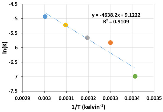 To calculate the activation energy of the applied reaction, the Arrhenius equation was applied in which the plot of ln(K) against 1/T (kelven−1) should give a straight line with a slope equal to –Ea/R, where R is the universal gas constant (Figure 11). The calculated activation energy (Ea) was 88.95 KJ/mol for Pt-ZSM-5.
