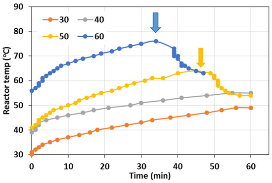 Change in the reactor temperature during the hydrogenation of cyclohexene over Pt-ZSM-5. Arrows are pointing to the 100% conversion of cyclohexene.