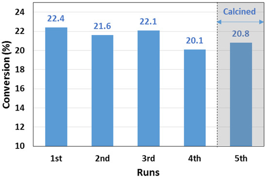 The reusability of the Pt-ZSM-5 was investigated by performing four consecutive runs using the same catalytic sample without any treatment, and a fifth run after thermal treatment at 300 °C for 180 min. The obtained results expressed by the conversion % of cyclohexene of the different runs are plotted in Figure 13. It is obvious that the Pt-ZSM-5 sample was able to activate the five runs at a good efficiency. Without treatment, the activity of Pt-ZSM-5 was reduced by 10% after four runs compared to a fresh sample. This is most likely due to the accumulation of organic species onto the surface of the catalysts, while after thermal treatment, only 7.1% loss in activity was obtained. This result clearly shows that Pt-ZSM-5 exhibited good stability after five runs.