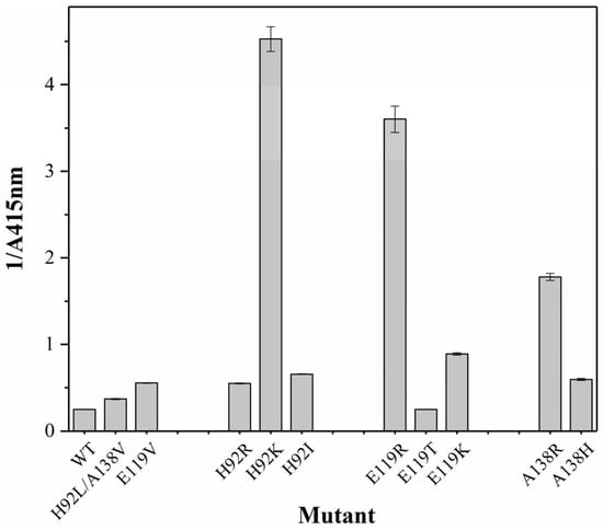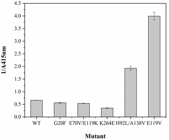 The re-screening results of WT, G20F, E70V/E119K, K264E, H92L/A138V, and E119V show that H92L/A138V and E119V are better than the WT (the higher the value of 1/A415nm, the higher the catalytic efficiency).