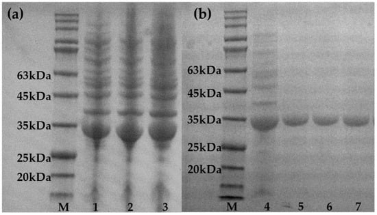 (a) SDS-PAGE electrophoresis results of WT, H92L/A138V, and E119V; the mutant has an over-expression band around 30 kDa similar to WT. Lane M: Protein Marker; Lane 1: WT; Lane 2: H92L/A138V; Lane 3: E119V; (b) Comparison of SDS-PAGE electrophoresis results before and after PPGMK purification. Lane M: Protein Marker; Lane 4: WT before purification; Lane 5: WT after purification; Lane 6: H92L/A138V after purification; Lane 7: E119V after purification.