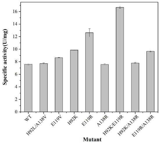 We combined the best mutations observed at the three sites into three mutants: H92K/E119R, H92K/A138R, and E119R/A138R. Then, we determined the enzyme activity of two mutants selected by random mutations, three single-point mutants, and three double-point mutants. These test results are shown in Figure 4. A138R did not increase or decrease the enzyme activity significantly. The increase in enzyme activity of the mutant containing A138R was also less than that of the mutant H92K/E119R, the combination of E119R and H92K. Among them, E119R increased the enzyme activity by about two times and was considered to be representative of the most improved thermal stability of the three mutation sites.
