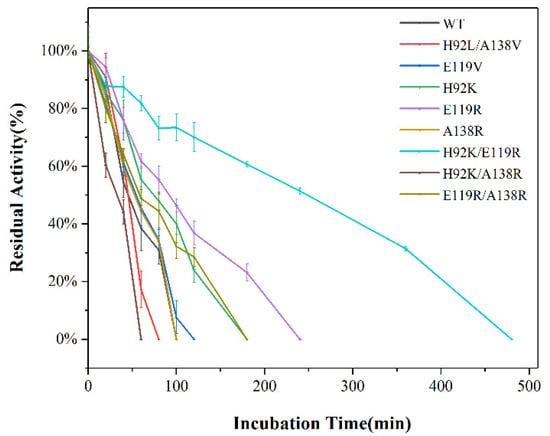 Thermal stability of WT, H92L/A138V, E119V, H92K, E119R, A138R, H92K/E119R, H92K/A138R, and E119R/A138R at 50 °C. Heat treatment at 50 °C for 0–480 min, with the reflected enzyme activity of each enzyme without heat treatment recorded at 100%. Determination of the residual vitality, where the value of each data point represents the average value.