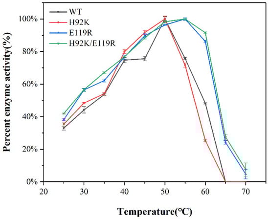 After discarding the mutants A138R, H92K/A138R, and E119R/A138R, the optimal temperature was determined for the remaining mutants and wild-type. At 25–70 °C, the temperature gradient was set to every 5 °C for measurement, and the enzyme activity at the optimal temperature of each enzyme was 100%, calculating the percentage value of enzyme activity of each enzyme. The measurement result is shown in Figure 6. The optimum temperature of WT and H92K was 50 °C, and the optimum temperature of E119 and H92K/E119R increased to 55 °C. It can be seen from Figure 6 that not only does the optimum temperature of E119R and H92K/E119R increase by 5 °C. Moreover, the enzymatic activity decreases more slowly with increasing temperature, while WT and H92K decrease rapidly after the temperature reaches 50 °C.