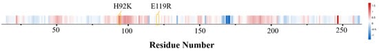 To further study the thermodynamic stability before and after the mutation, we used MD to perform 100 ns for wild-type and mutants at 300 K. The MD results are presented in the form of a heatmap in Figure 7, and the values represent the difference values between WT and H92K/E119R. Positive values (red) indicate that the WT has a higher RMSD/RMSF value than H92K/E119R, and negative values (blue) indicate that the WT has a lower RMSD/RMSF value than H92K/E119R.