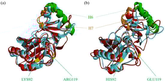 Running MD at a high temperature, even if using an unreasonable temperature such as 500 K or 600 K [19,31] will only accelerate the unfolding speed of the protein without changing the unfolding path of the protein [32]. To observe the conformational changes of WT and H92K/E119R proteins more intuitively, MD was run at 300 K and 360 K, we superimposed the protein conformations, and compared the results. This result is shown in Figure 8, where the three-dimensional conformation of WT protein at 360 K has a relatively large change compared with that at 300 K. The RMSD is 3.5140 Å, the loop area changes greatly, and the α-helix and β-sheet parts of the structure collapse seriously. This shows that WT is more sensitive to temperature increases, and its stability is slightly worse. However, we found that the three-dimensional protein conformation of mutant H92K/E119R at 360 K has little change compared with that at 300 K, and the RMSD is 2.5736 Å. The α-helix and β-sheet area basically overlap, and only the loop area shows some changes. Before this, the protein structure of PPGMK had been analyzed and the secondary structure had been named [33]. We compared each α-helix and β-sheet after MD and found that the RMSD of the two α-helices H6 and H7 of H92K/E119R decreased by more than 50% compared with WT. This indicates that the stability of the two helices improved after mutation. It can be observed that the spatial distance between the two helices and the mutation site is relatively far, which may be due to the mutation affecting the entire protein backbone, resulting in effects on more distant area, whereby a similar situation had also occurred in the directed evolution of cellulases [21]. After running MD at 360 K and 300 K, the RMSD of H92K/E119R was recorded at only 73% of that of the WT. The protein structure of H92K/E119R has a higher degree of coincidence with 300 K after simulation at 360 K than the WT, which further indicates that the thermal stability of H92K/E119R is improved after mutation.