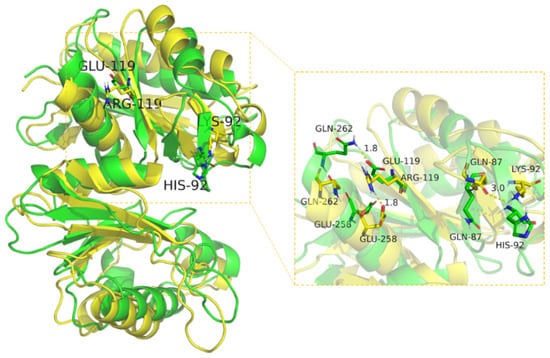 The binding mode comparison of WT (green) with H92K/E119R (yellow) protein.