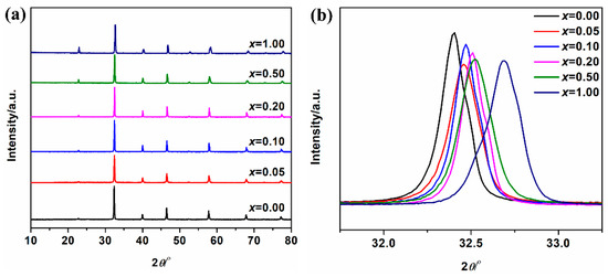 (a) XRD patterns of the SrLaTiCrO-x samples with x equal to 0.00, 0.05, 0.10, 0.20, 0.50 and 1.00. (b) Detailed XRD patterns around the strongest diffraction peaks (121) in the 2θ range from 31.75 to 33.25o.