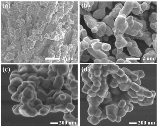 The morphologies of typical samples were observed by scanning electronic microscopy (SEM), and the images are shown in Figure 2. SrTiO3 was composed of irregular block structures aggregated with polyhedral nanoparticles, and the size ranged from 200~500 nm (Figure 2a). On the contrary, LaCrO3 exhibited relatively larger irregular spherical particles with sizes of 1~3 μm (Figure 2b). The SEM images with higher magnification of pure SrTiO3 and SrTiO3–LaCrO3 solid solution with a LaCrO3 content of 0.10 (labeled as SrLaTiCrO-0.10 in later discussion) are shown in Figure 2c,d, respectively. It was observed that SrLaTiCrO-0.10 exhibited analogous morphologies with that of pure SrTiO3, indicating that the formation of the solid solution had a limited influence on the micro-nanostructure of the SrTiO3 photocatalyst.
