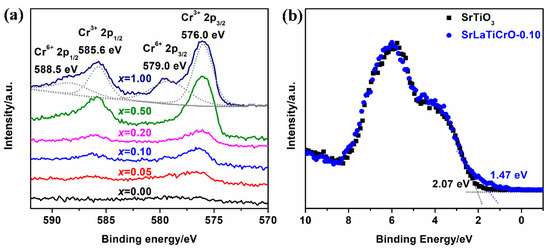 (a) High-resolution XPS spectra of Cr 2p orbitals of the SrLaTiCrO-x samples with x equal to 0.00, 0.05, 0.10, 0.20, 0.50 and 1.00. (b) VB spectra of SrTiO3 and SrLaTiCrO-0.10.