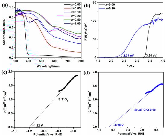 The band structures of the as-prepared samples were analyzed by combining their light absorption properties and electrochemical results. Tauc plots and the Kubelka–Munk method are widely used to calculate the actual bandgap of semiconductors [37,48]. Figure 4b displays the Tauc plots for the bandgap analysis of SrTiO3 and SrLaTiCrO-0.10. Through calculation using the Kubelka–Munk method, the bandgap of SrTiO3 and SrLaTiCrO-0.10 were determined as 3.30 and 2.37 eV, respectively. Figure 4c,d displays the Mott–Schottky (M–S) curves of SrTiO3 and SrLaTiCrO-0.10, from which the flat band potentials of the two samples were determined as −1.22 and −0.90 V, respectively. As for the typical n-type semiconductor, the flat band potential was estimated as 0.1~0.2 V (taking 0.1 herein), which less negative than the conduction band maximum (CBM) and has been widely used to determine its conduction band position [49,50,51]. Therefore, the CBM of SrTiO3 and SrLaTiCrO-0.10 was determined to be −1.32 and −1.00 V, respectively. Given the above results on the bandgaps, the corresponding VBM was determined to be 1.98 and 1.37 V, respectively, for SrTiO3 and SrLaTiCrO-0.10. The difference in the VBM for SrTiO3 and SrLaTiCrO-0.10 (~0.61 V) was almost the same as that obtained from the XPS VB spectra, demonstrating the feasibility of both characterization techniques. Therefore, both the conduction band and valence band of SrTiO3 were modulated by the introduction of LaCrO3 content, demonstrating the effect of solid solution construction.