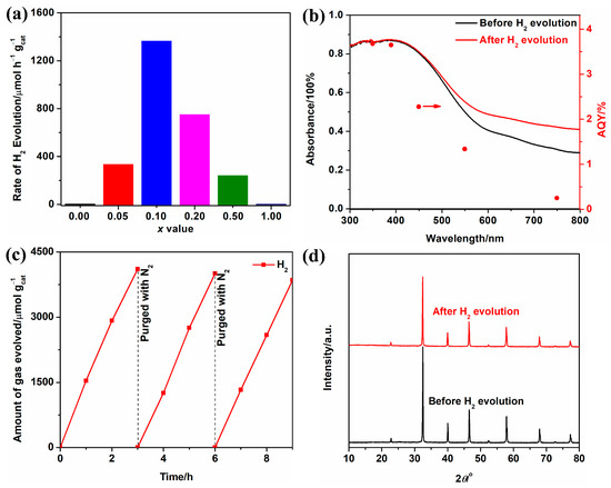 The photocatalytic activities of the as-prepared solid solution samples were evaluated, and the results are shown in Figure 5. No H2 was detected in the absence of either photocatalyst or light irradiation, thereby excluding the possibility of photolysis as well as non-photocatalytic effect (e.g., mechanocatalysis). Due to the wide bandgap, SrTiO3 was incapable of utilizing visible light and showed negligible H2 evolution under visible light irradiation. On the other hand, owing to the weak driving force for reducing H2O to H2 originating from the relatively low CB level, LaCrO3 showed only a trace amount of H2 evolution, although it was able to absorb visible light up to 600 nm. In contrast, the as-prepared SrTiO3–LaCrO3 solid solutions with both members exhibited noteworthy H2 evolution under visible light irradiation, and when the LaCrO3 content was 0.10, an optimized H2 evolution rate of 1368 μmol h−1 g−1 was obtained. On the basis of the photocatalytic H2 evolution test, the construction of the solid solutions between SrTiO3 and LaCrO3 was demonstrated to be an effective strategy to exploit novel visible-light-driven photocatalysts for H2 evolution.
