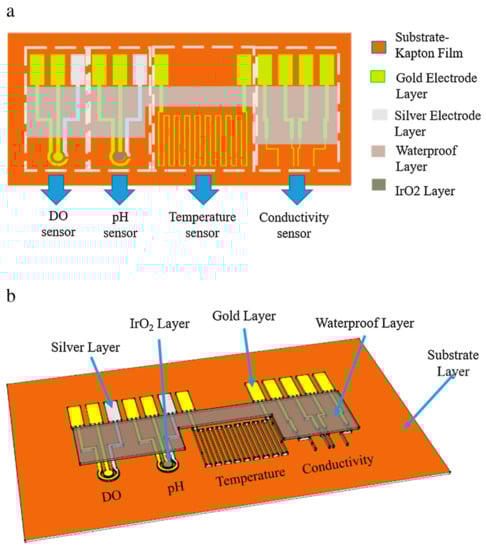 Image of dissolved oxygen (DO), pH, temperature, and conductivity MEA sensors (a) and layers on each MEA sensor (b). Reprinted with permission from Ref. [21]. (Copyright, 2016, Elsevier).