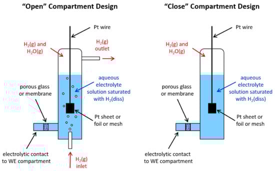 “Open” and “close” designs of the reference electrode compartment of the hydrogen reference electrode, reprinted with permission from reference [56]. (Copyright, ACS, 2020).