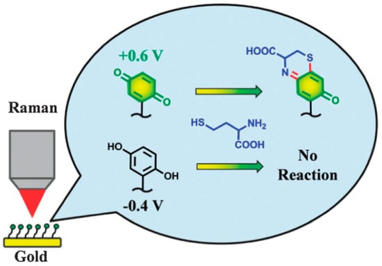 The most common method to fabricate quinone hydroquinone sensors is self-assembly (SAM) because of simple operation, chemical availability, etc. [67]. There are different kinds of SAM surface reactions. For instance, Zhang et al. [68] demonstrated that a representative reaction, which is a modulated quinone hydroquinone transition and heterocyclization produced by benzoquinone and L-cysteine (shown in Figure 5). Quinone hydroquinone can be used as the composition of nanomaterial to achieve biosensors. As the transform of dopamine and dopaquinone can be a symbol of pH changes, Medintz et al. [69,70] studied that the biosensor consisted of dopamine and quantum dots conjugates to detect whether cells undergo drug-induced alkalosis by measuring cytoplasmic pH.