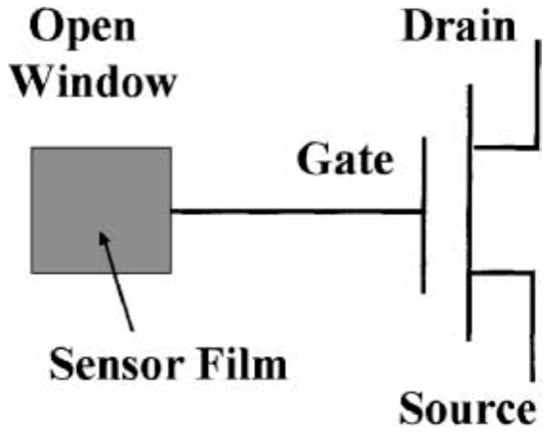 ISFET, a new type of pH-sensitive device invented by Bergveld in 1981 [87], the main material is a silicon chip. The structure of ISFET is similar to that of MOSFET (metal-oxide-semiconductor field effect transistor) but the ion-sensitive membrane is used to replace the metal gate of the MOSFET [88]. After the contact between the sensitive membrane and solution, the Nernst response to hydrogen ions occurs. The specific structure and design of the device are shown in Figure 7. Compared to other pH sensors, the ISFET pH electrode has good precision, repeatability, miniaturization, and short response time while the limitation of the large size of the ISFET sensor for further employment becomes the main disadvantage [89,90].
