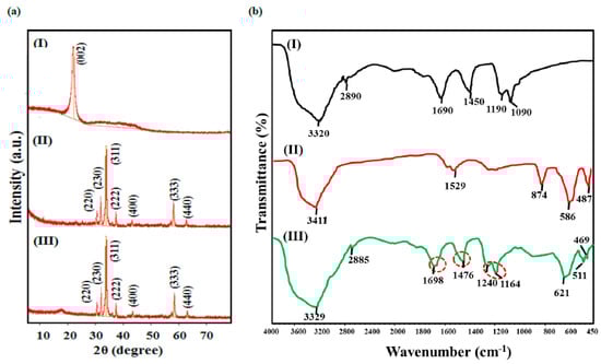 (a) XRD patterns and (b) FT-IR spectra of (I) CQDs, (II) Sr0.4Ti0.6Fe2O4.6 NPs and (III) CQDs− Sr0.4Ti0.6Fe2O4.6 nanocomposite.