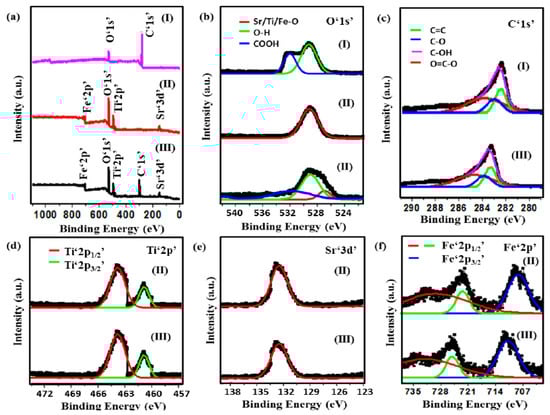 (a) XPS survey spectra, XPS high-resolution spectra of (b) O‘1s’, (c) C‘1s’, (d) Ti‘2p’, (e) Sr‘3d’ and (f) Fe‘2p’ of (I) CQDs, (II) Sr0.4Ti0.6Fe2O4.6 NPs and (III) CQDs−Sr0.4Ti0.6Fe2O4.6 nanocomposite.