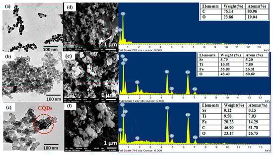 TEM and SEM-EDS images along with table of elemental composition in the inset of EDS pattern (a,d) CQDs, (b,e) Sr0.4Ti0.6Fe2O4.6 and (c,f) CQDs-Sr0.4Ti0.6Fe2O4.6 nanocomposite.
