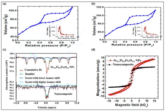 BET isotherm curves and pore size distribution (inset) of (a) CQDs, (b) CQDs−Sr0.4Ti0.6Fe2O4.6 nanocomposite, (c) Mӧssbauer spectra and (d) hysteresis curves of Sr0.4Ti0.6Fe2O4.6 and (d) CQDs−Sr0.4Ti0.6Fe2O4.6 nanocomposite.