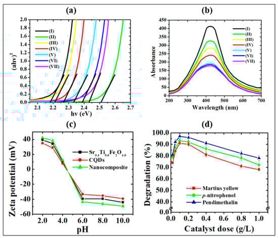 (a) Tauc plot and (b) photoluminescence spectra of (I) Sr0.4Ti0.6Fe2O4.6, (II) CQDs, (III) CQDs−Sr0.4Ti0.6Fe2O4.6 (0.5:1.0), (IV) CQDs−Sr0.4Ti0.6Fe2O4.6 (1.0:1.0), (V) CQDs−Sr0.4Ti0.6Fe2O4.6 (2.0:1.0), (VI) CQDs−Sr0.4Ti0.6Fe2O4.6 (4.0:1.0) and (VII) CQDs−Sr0.4Ti0.6Fe2O4.6 (8.0:1.0) nanocomposites, (c) Zeta potential curve, (d) effect of catalyst dose (experimental conditions: pH, 3.0; irradiation time, 2 h and concentration 2.0 mg/L (p-nitrophenol and pendimethalin and 0.2 mg/L (martius yellow))).