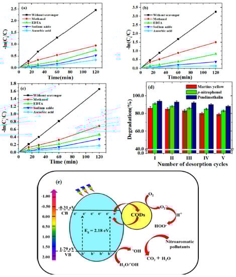 In order to examine the reactive oxygen species that cause the degradation of nitroaromatic contaminants, a free radical trapping experiment was performed under the optimized experimental conditions. In this respect, kinetic studies in the presence of different scavengers, such as ascorbic acid, sodium azide, EDTA and methanol, were conducted to scavenge the superoxide radicals, singlet oxygen, holes and hydroxyl radicals, respectively. The experimental results of the trapping species, as shown in Figure 7a–c, indicate that superoxide radical anions and singlet oxygen species were the primary species involved in the photodegradation process of nitroaromatic pollutants. The photodegradation process was kinetically inhibited in the following order: