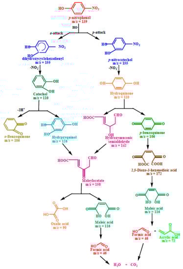 The first step in the photodegradation of p-nitrophenol, as illustrated in Scheme 1, involved the o- and p-attack of the hydroxyl radical and led to the formation of hydroxylated adducts, viz. dihydroxycyclohexadienyl radical (DHCHD) (m/z = 155) and p-nitrocatechol (m/z = 155). The −NO2 group might be released from DHCHD and p-nitrocatechol and yielded by the hydroquinone (m/z 110) and catechol (m/z 110), respectively. The hydroxylation of catechol (m/z 110) generates the hydroxyquinol (m/z = 126). The C-C bond with the adjacent hydroxyl groups in hydroxyquinol (m/z = 126) is destabilized due to the electrophilic nature of hydroxyl groups, causing ring rupturing with the formation of maleyl acetate (m/z = 158). Furthermore, the complex intermediate formed by the ring cleavage of hydroquinone (m/z = 110) is hydroxymuoconic semialdehyde (m/z = 142), which can then be oxidized to maleylacetate (m/z = 158). The products of the oxidative ring opening of p-benzoquinone (m/z = 106) and the mineralization of maleylacetate (m/z = 158) are low-molecular carboxylic acids such as 2,5-dioxo-3-hexene dioic acid (m/z = 172), maleic acid (m/z = 114), oxalic acid (m/z = 90), acrylic acid (m/z = 72), acetic acid (m/z = 60) and formic acid (m/z = 46), and these acids can be mineralized to CO2 (m/z = 44) and H2O (m/z = 18).