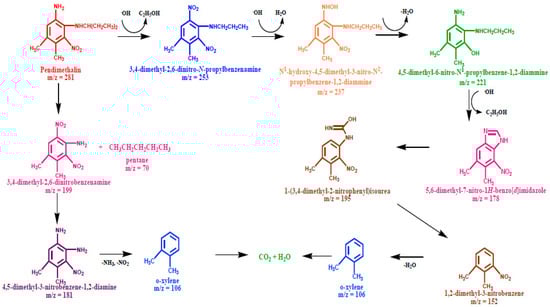 The photodegradation of pendimethalin, as shown in Scheme 2 could be fragmented through two pathways: (a) the hydroxylation of aromatic ring due to formation of 3,4-dimethyl-2,6-dinitro-N-propylbenzenamine (m/z = 253) after the elimination of the ethanol molecule. The further attack of OH radical resulted in a dehydrated adduct, with the ion peak attributed to N1-hydroxy-4,5-dimethyl-3-nitro-N2-propylbenzene-1,2-diammine (m/z = 237). The GC-MS spectrum displayed the molecular ion peaks indicating the formation of 4,5-dimethyl-6-nitro-N2-propylbenzene-1,2-diammine (m/z = 221) and 5,6-dimethyl-7-nitro-1H-benzoimidazole (m/z = 221) via the elimination of water and ethanol, respectively. Subsequently, the fragment peak at the m/z value of 195 appeared from the ring opening of 5,6-dimethyl-7-nitro-1H-benzoimidazole corresponding to 1-(3,4-dimethyl-2-nitrophenyl) isourea, followed by the C-N bond cleavage of the side chain to produce 1,2-dimethyl-3-nitrobenzene (m/z = 152). (b) The C-N bond cleavage on the dealkylation of side chain yielded the 3,4-dimethyl-2,6-dinitrobenzenamine product (m/z = 199), followed by the reduction of one of nitro group present on the aromatic ring to generate 4,5-dimethyl-1,3-dinitrobenzene-1,2-diamine (m/z = 181). The appearance of o-xylene (m/z = 106) might occur either with the elimination of the nitrogen dioxide and ammonia molecules from 4,5-dimethyl-1,3-dinitrobenzene-1,2-diamine (m/z = 181) or with the denitration of 1,2-dimethyl-3-nitrobenzene which finally mineralizes to CO2 (m/z = 44) and H2O (m/z = 18).