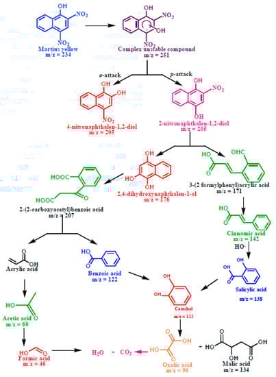 The photocatalytic degradation of martius yellow (Scheme 3) initiated through the oxidative ortho- and para-attack of the OH radical across the double bond present on the chromophoric ring formed the hydroxylated adduct of martius yellow (m/z = 251). The unstable nature of the hydroxylated adduct caused the elimination of the NO2 group with the generation of 4-nitronapthalen-1, 2-diol (m/z = 205) and 2-nitronapthalen-1,4-diol (m/z = 205). The appearance of an ion peak at m/z value of 176 might be ascribed to the formation of 2,4-dihydroxynapthalen-1-ol due to the •OH attack on 4-nitronapthalen-1, 2-diol (m/z = 205). The destabilization of the C=C bond with adjacent OH groups caused the ring to rupture and yielded acrylic acid (m/z = 72) and benzoic acid (m/z = 122). The catechol peak (m/z = 110) appeared, possibly due to the attack of the OH radicals on the aryl ring of benzoic acid. The C-C bond cleavage could also occur in the 2-nitronapthalen-1,4-diol (m/z = 205) with the denitration and decarboxylation, resulting in the appearance of cinnamic (m/z = 148) and formic acid (m/z = 46). The further C-C cleavage of cinnamic acid yielded the salicylic acid (m/z = 138), followed by the formation of catechol at the m/z value of 110. The intermediate catechol (m/z = 110) was unstable under atmospheric conditions, and subsequently decomposed to produce malic acid (m/z = 134) after decarboxylation. The stepwise decarboxylation of malic acid (m/z = 134) and acrylic acid (m/z = 72) could subsequently be mineralized to CO2 and H2O.