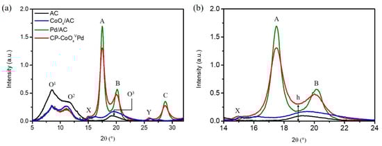 (a) The comparative XRD patterns of CP-CoOxVPd NC and reference samples (AC, CoOx/AC, and Pd/AC). The enlarged XRD pattern at the 2θ range between 14° and 24° is shown in (b). The wavelength of incident X-ray for XRD measurement is 0.6888 Å (18.0 KeV).