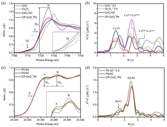 X-ray absorption spectroscopy of the experimental NCs compared with reference samples. (a) XANES and (b) FT-EXAFS spectra of the experimental NCs at Co K-edge. (c) XANES and (d) FT-EXAFS spectra of the experimental NCs at Pd K-edge. In the FT-EXAFS spectra at Co K-edge, peak CoOcta-CoOcta is the contribution of coordinated Co atoms at octahedral symmetry from the 2nd coordination shell in CoO lattice. The peak of CoTetra-CoOcta is the contribution of coordinated Co atoms (tetrahedral symmetry) in the 2nd coordination shell of CoOx lattice. * The intensity of Pd foil is reduced by 50% for better representation.