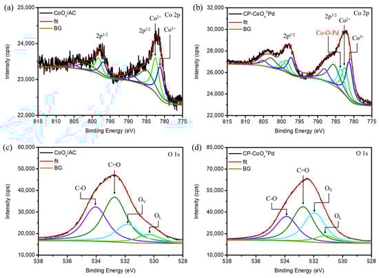 X-ray photoelectron spectroscopy of (a) CoOx/AC and (b) CP-CoOxVPd NCs at Co-2p orbital. (c) CoOx/AC and (d) CP-CoOxVPd NCs at O-1s orbital.
