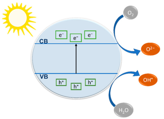 Electrons in a solid material are located in an energy spectrum that is composed of the valence band (VB) and the conduction band (CB). Generally, the difference between the top of VB and the bottom of CB in a photosensitive material is called a band gap [24]. When the photosensitive material absorbs light with an energy higher than that of the band gap of the material, an electron (e−) moves from the VB to CB leaving a hole (h+) in the VB. In this case, the electron is mobile within the excitation zone and possesses a high reduction potential. In addition, the generated hole is mobile and acts as a one-electron oxidizer. The next stage could be one of the two options: (i) the electron moves back to the VB to regenerate the photocatalyst (Equation (2)) or (ii) redox reaction takes place between the electron-hole pair, and the molecules exist on the surface of the material (Equation (3)) [25].