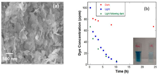 SEM image of the fabricated WS2 nanosheets (a). Photocatalytic activity of WS2 nanosheets: concentration change of BG solution in the presence of WS2 (inset image represents the corresponding samples) (b). Reproduced with permission [19]. Copyright 2015, Springer Nature.