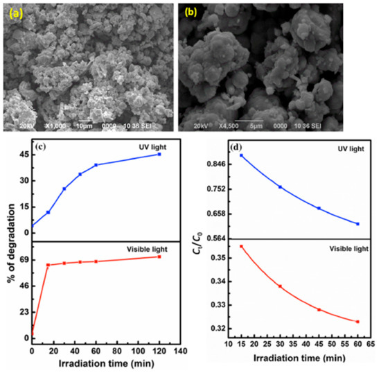In addition, Hazarika and Mohanta reported a hydrothermal method for the synthesis of inorganic fullerene (IF)-type WS2 nanoparticles and their application in the photodegradation of malachite green (MG) considering both UV and visible light. IF-WS2 nanoparticles’ morphology was observed by SEM as shown in Figure 3a,b. In addition, the band gap of the prepared WS2 was predicted via Tauc’s plot to be around 1.9 eV. The synthesized IF WS2 nanocatalyst exhibited an enhanced photocatalytic response with the dye degradation that reached 71.2%. The photodegradation activity of the as-prepared nanoparticles was studied as shown in Figure 3c,d.
