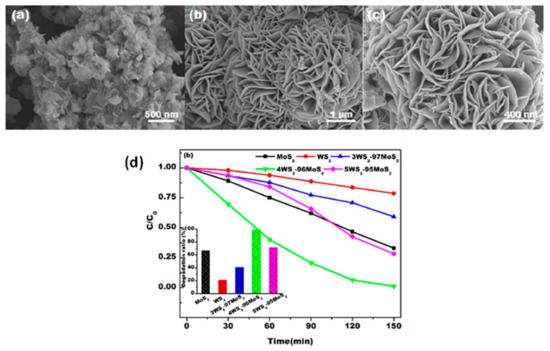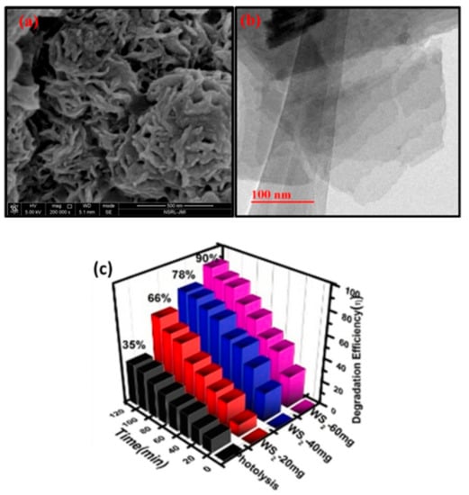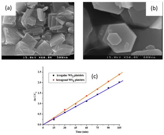 Another successful work by Vattikuti and his team was the synthesis of hexagonal-shaped WS2 platelets via the simple hydrothermal method, which showed great photocatalytic activity for the photodegradation of rhodamine B (RhB) compared to the irregular WS2 platelets. They formed the hexagonal WS2 by the oriented attachment (OA)-self-assembly (SA) with a thickness ranging between 20 and 100 nm. SEM images of both hexagonal and irregular-shaped platelets are shown in Figure 4a,b. The synthesized platelets are kinetically stable due to their anisotropic structures and the wide surface energy distribution, as well as the predominantly open reactive sites. The optimal conditions for the growth of the platelets were 150 °C and 12h. SEM image of the corresponding sample is shown in Figure 4b. Moreover, these platelets provided a higher RhB degradation activity of 98% in 105 min, and they showed better activity than the irregular-shaped platelets according to Figure 4c.