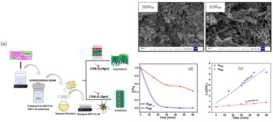 Schematic illustration of the synthesis of WS2 nanostructures hydrothermally (a), FE-SEM images of WNS (b) and WNR (c), C/C0 vs. time plot (d), and −ln(C/C0) vs. time plot (e). Reproduced with permission [77]. Copyright 2019, Springer Nature.