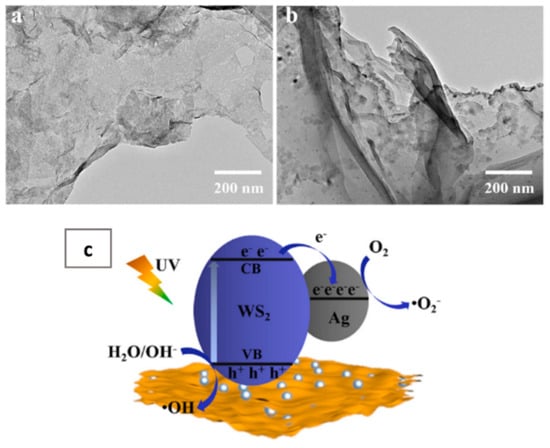 TEM images of hybrid Ag/WS2 nanoflakes (a,b), schematic diagram for the photodegradation mechanism of Ag/WS2-2 (c). Reproduced with permission [79]. Copyright 2022, Elsevier.