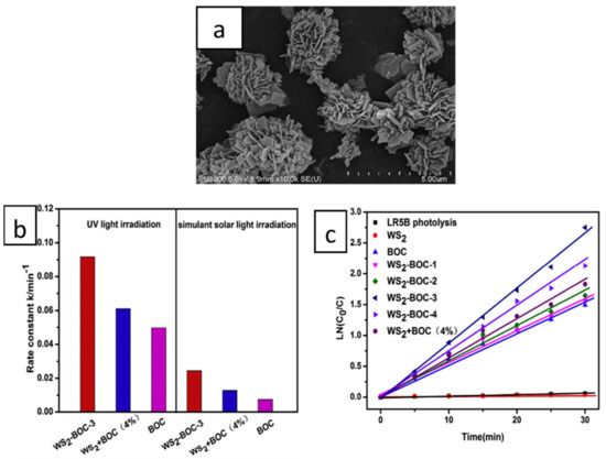 A novel flower-like WS2/Bi2O2CO3 photocatalyst was fabricated by Li and his team using a one-pot hydrothermal method. They synthesized the photocatalyst with a varied mass ratio of WS2 as the following: 1, 2, 4, and 6 wt%, and then labeled them as WS2-BOC-1, WS2-BOC-2, WS2-BOC-3, and WS2-BOC-4, respectively. The team studied the morphology of the composites by FE-SEM. The composite WS2-BOC-3 showed the best photocatalytic performance among other BOC samples and bare WS2 as represented in Figure 9b. The morphology of WS2-BOC-3 is represented in the FE-SEM image in Figure 9a. This heterostructure showed efficient removal of Lanasol red 5B (LR5B) with a rate constant of 1.85 times higher than Bi2O2CO3 under UV and 3.23 times under simulated solar irradiation as shown in Figure 9c. This enhanced activity was attributed to the synergistic effect of the photoinduced charge carrier separation and transfer, the improved light harvesting ability, and the higher specific surface area resulting from the unique flower-like structure. Furthermore, the material was found to be stable and recyclable by applying cyclic testing.