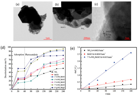 TEM and HRTEM images of the composite 7%-WS2/BiOCl (a–c), photocatalytic decolorization rate plot of varied mass ratios of WS2/BiOCl (d), kinetic analysis curve of WS2, BiOCl, and 7%-WS2/BiOCl (e). Reproduced with permission [84]. Copyright 2020, Springer Nature.