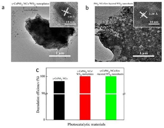 Zhang, Tai, Zhou, and others developed two different γ-CsPbI3 nanocrystal (NCs)/WS2 heterostructures with two different 2D morphologies of WS2, which are nanoplates and few-layered nanosheets, and they were characterized using several techniques such as TEM (Figure 13a,b). This heterostructure helps to overcome the weaknesses of CsPbI3 as a photocatalyst, such as the significant photoluminescence quenching and the existence of ligands attached to the surface of nanocrystals. The authors found that WS2 provides a large surface area and abundant functional groups (e.g., C=O, -OH, C=C) on the surface, which facilitate bonding interaction with the precursors in the mixture solution and hence reduce the number of ligands and improve the nanocrystals of γ-CsPbI3, which can be observed in Figure 13c that compares the photocatalytic degradation efficiency of γ-CsPbI3 NCs, γ-CsPbI3 NCs/WS2 nanoplates, and γ-CsPbI3 NCs/few-layered WS2 nanosheets. Moreover, they concluded that γ-CsPbI3 nanocrystals heterostructured with few-layered WS2 nanosheets showed an improved photocatalytic activity due to the outstanding carrier-transport property introduced by WS2 nanosheets. Consequently, this leads to producing more hydroxyl radicals to photodegrade methylene blue in high efficiency that reaches 100% in 30 min with no intermediate degradation products. Generally, the team offered a superior method for enhancing the photocatalytic activity of γ-CsPbI3 NCs. In addition, the important role of tuning the surface interactions and carrier transport through 2D materials was successfully demonstrated.